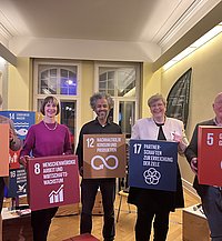 Villa Gründergeist Heute Gesellschaft gestalten! Christiane Moser-Eggs Referenzpunkt: Die 17 Nachhaltigkeitsziele der Vereinten Nationen (SDGs). Veranstalter:innen und Podiumsteilnehmer mit ihren Lieb