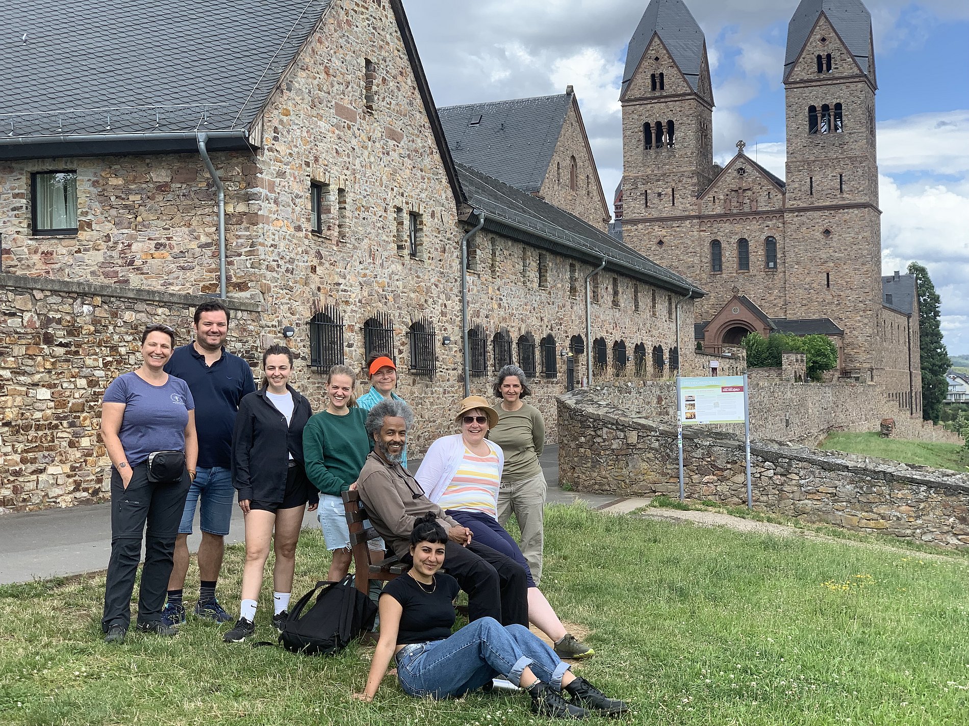 Mit geschärften Sinnen erreichen wir die Benediktinerinnenabtei St. Hildegard. Jeden Mittag finden dort das Mittagsgebet statt. Gesungen von den Ordensfrauen der Abtei. Wir nehmen an der sehr kontemplativen Unterbrechung teil und es lässt sich an uns selbst schon ein Unterschied bemerken. Wir sind ruhiger geworden als wir die große Abteikirche in Richtung Klostercafé verlassen. Unruhe kommt erst wieder auf, als wir feststellen, dass es nur noch einige wenige Nussecken für uns gibt. Die letzten Exemplare kaufen wir restlos auf und wie es sich gehört, wird anschließend im Klosterhof geschwisterlich geteilt. Eine Ausstellung vor Ort gibt uns auch weiteren Einblick in die Umbrüche, die der Benediktinerinnenabtei bevorstehen. Im Kunstkeller besuchen ein paar von uns eine Ausstellung dazu. Studierende für Innenarchitektur der Hochschule Mainz, zeigen ihre Entwürfe für ein Kolumbarium in der Krypta von St. Hildgard. Auch vor dem ehrwürdigen Kloster mit seinen engagierten ordensfrauen machen die großen Transformationsumbrüche nicht halt.